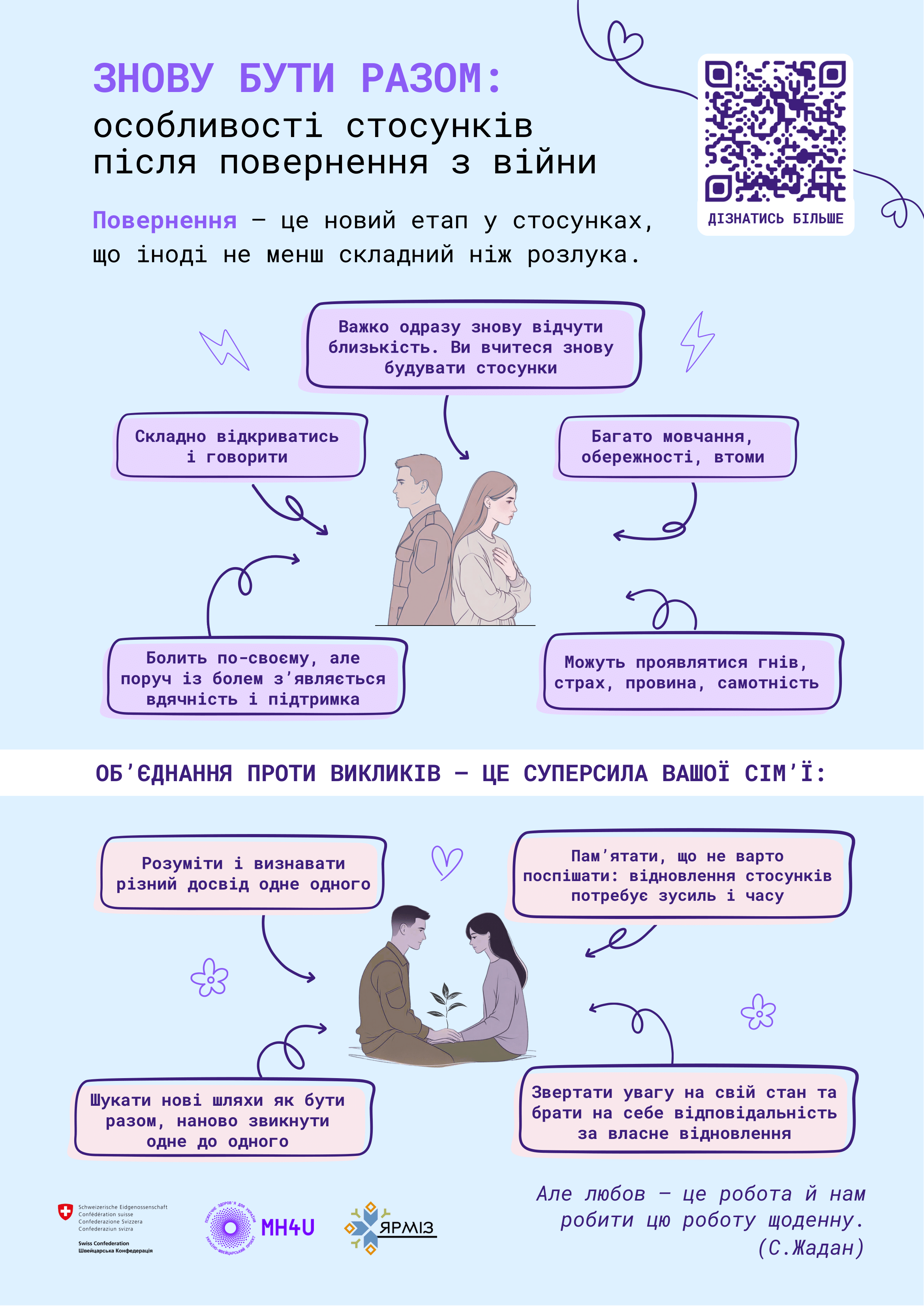 Постер містить загальну інформацію про особливості сспілкування в родинах військовослужбовців та ветеранів під час та після служби. Постер містить QR-код, який перенаправляє на брошуру з більш детальною інформацією.